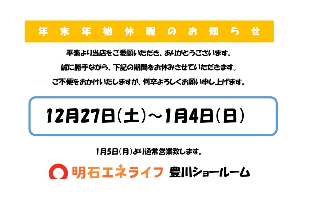 年末年始休業期間のお知らせです。